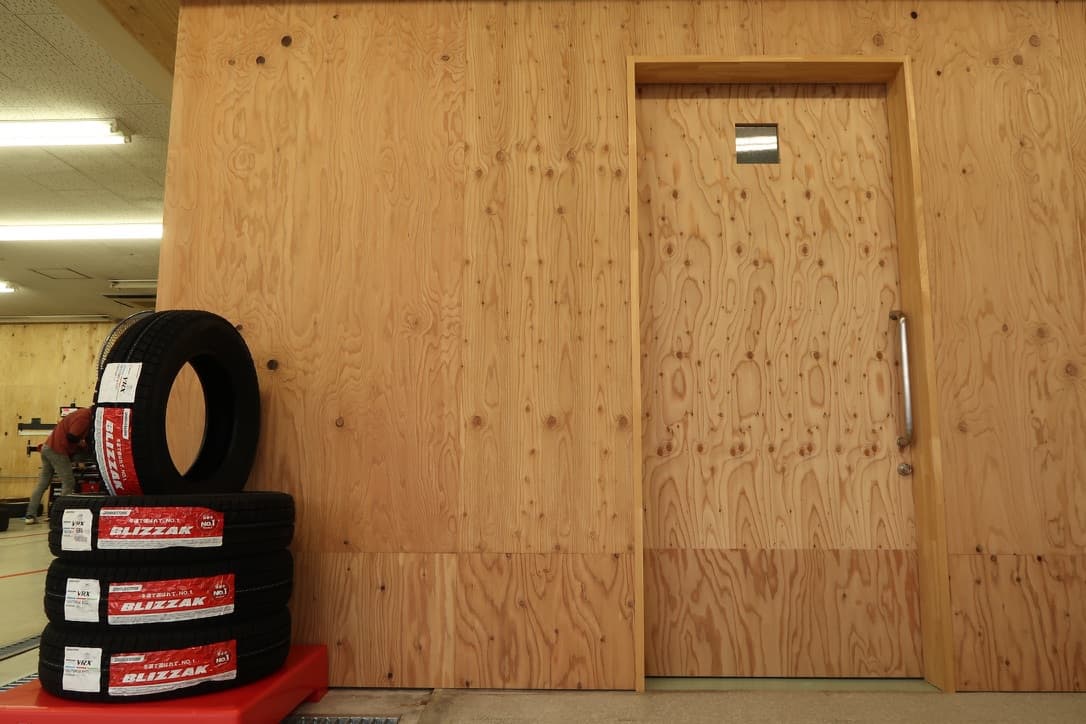 特注の鋼製ブレスを用いた軽やかな木造トラスによって大きな空間を実現しました。室内は合板で木質の仕上げにし、今後必要に応じてカスタムするのも容易です。大開口の電動シャッターによって使い勝手も最高です。