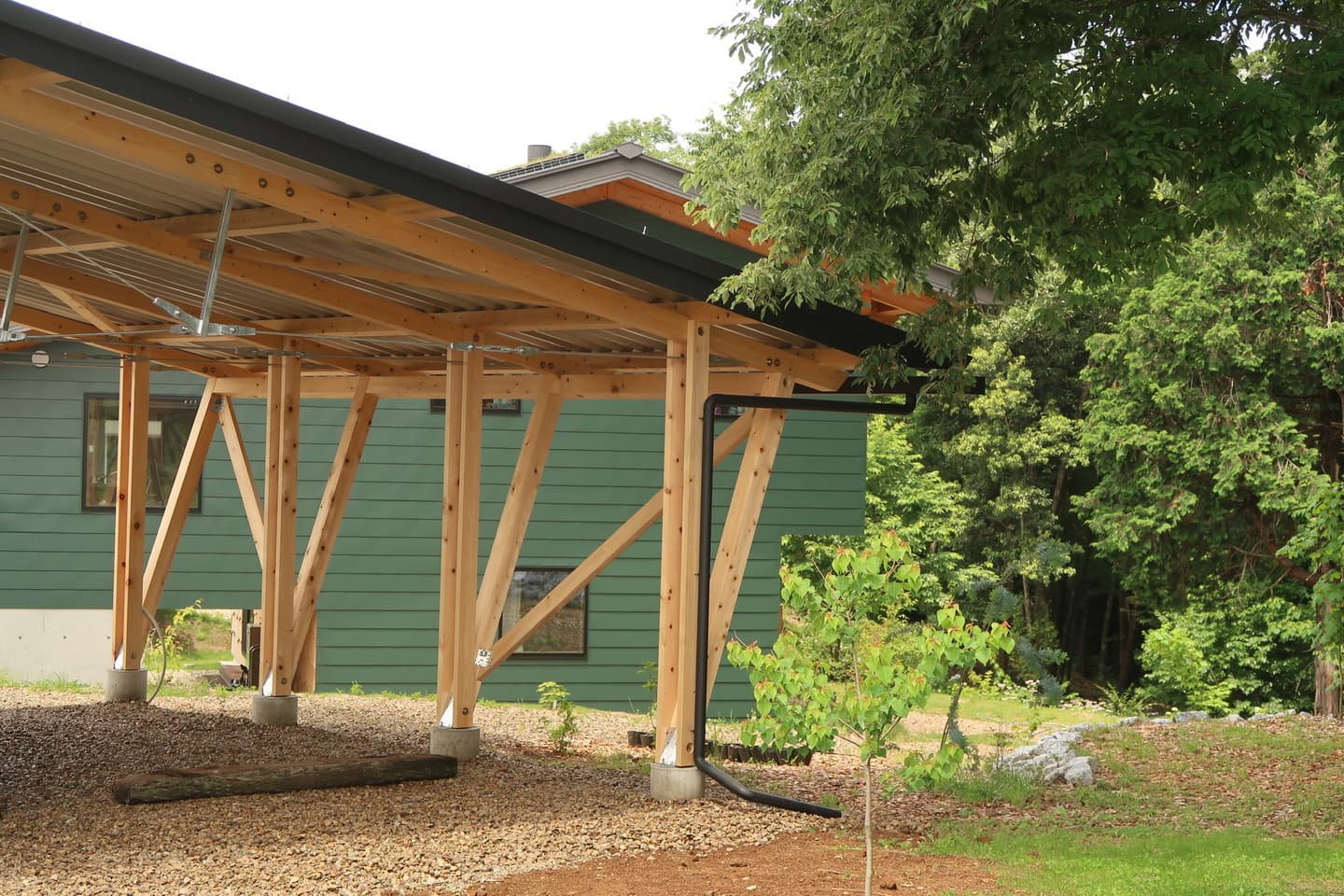 壁のように急な屋根の下には自転車なども収納することもでき、配置する向きによっては視線を遮ることもできます。