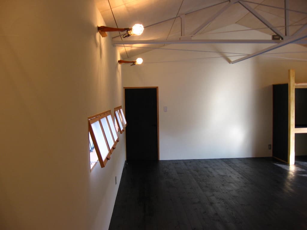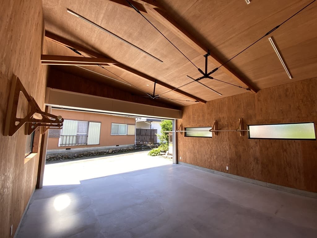 特注の鋼製ブレスを用いた軽やかな木造トラスによって大きな空間を実現しました。室内は合板で木質の仕上げにし、今後必要に応じてカスタムするのも容易です。大開口の電動シャッターによって使い勝手も最高です。
