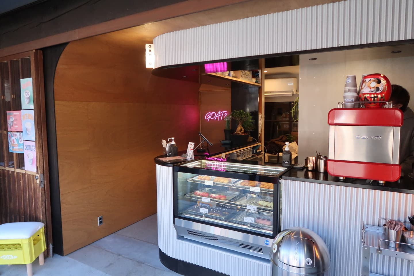 犬山城下町の古民家の町屋を改装したコーヒースタンド。湾曲した天井によって狭小ながらも室内のスタンドスペースに誘うトンネルのような空間。あえて古民家的なものとは違った異質な空間を古民家のファサードにはめ込んだような印象ですが、既存の格子戸を細工して再利用したことによって新旧が程よく共存しています。