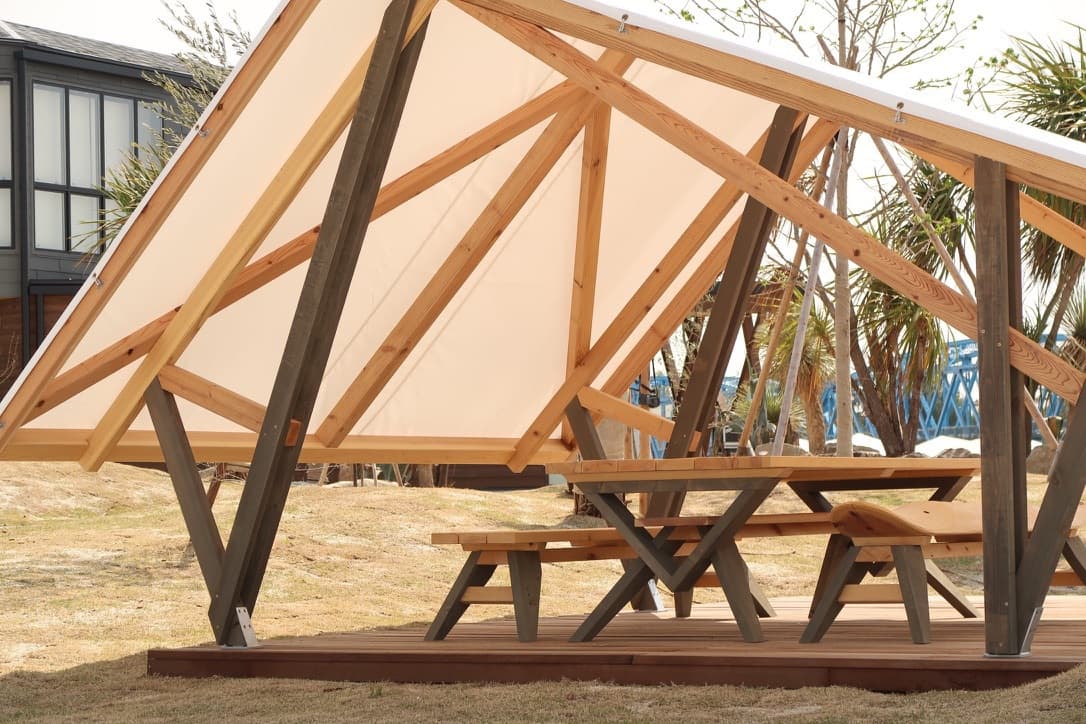 細めの杉材で軽やかにトラス構造で組みました。配置する向きによっても適度に視線と日差しを遮り、気の合う仲間とのBBQは気持ちも豊かになります。屋根はテント生地で強風時には取り外すことができます。