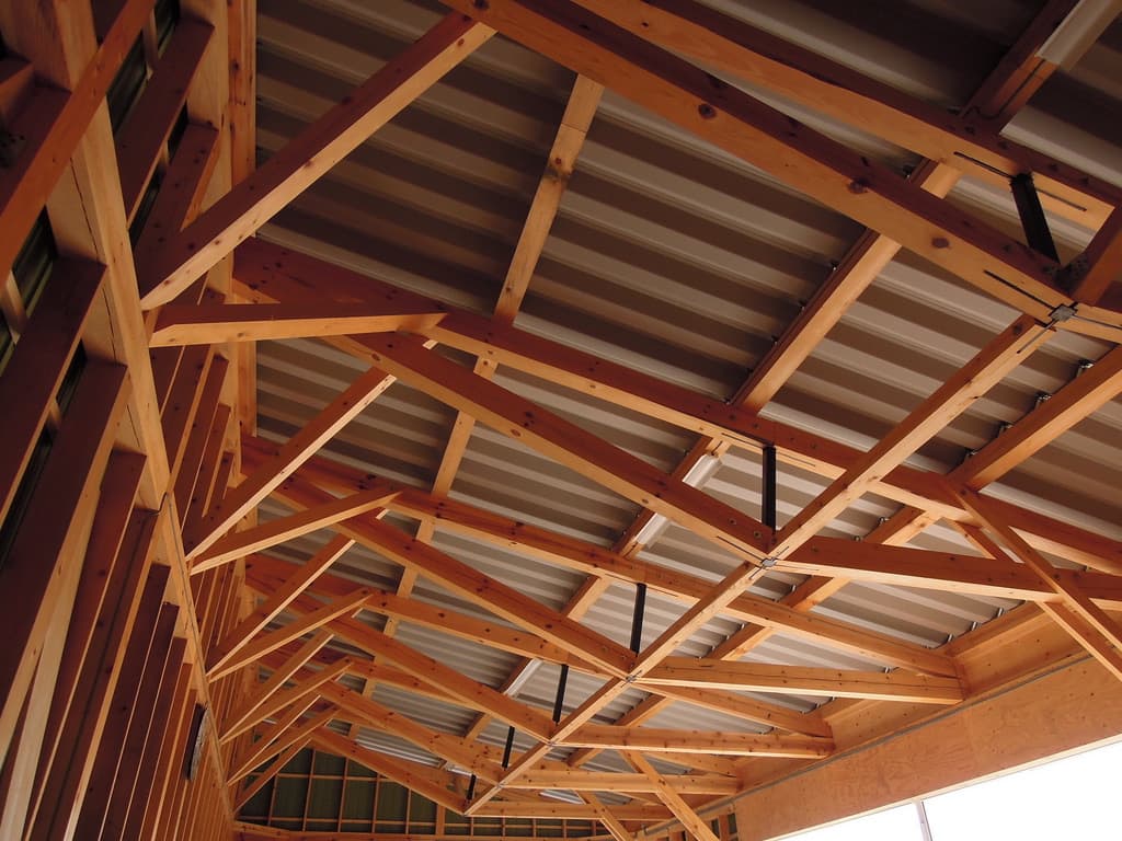 東濃桧と特注鋼製ブレスの木造トラスを使用することで大きな木材の梁を使用することなく軽やかに大空間を実現しました。